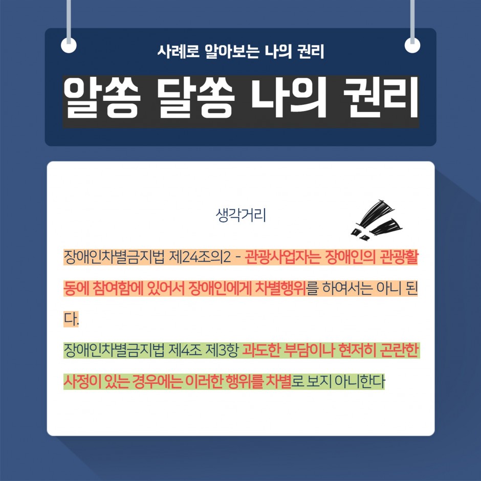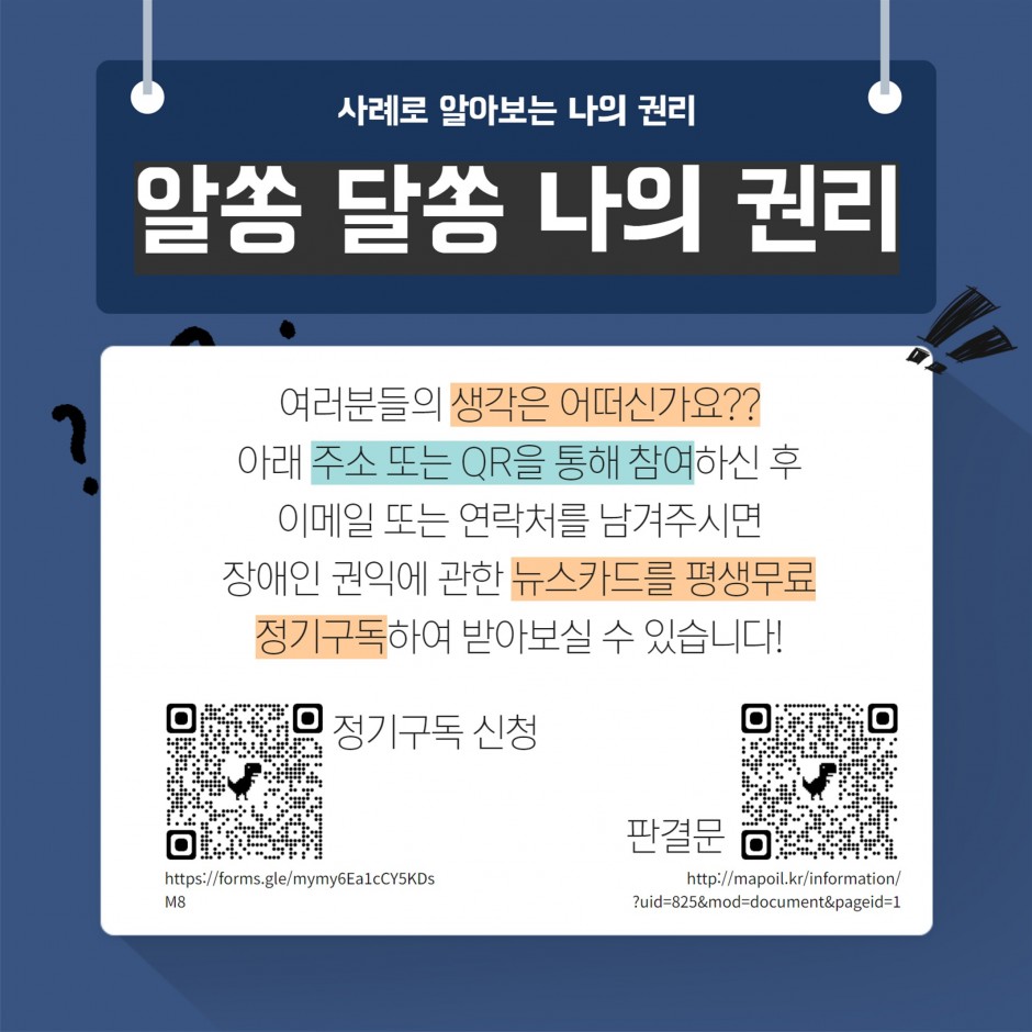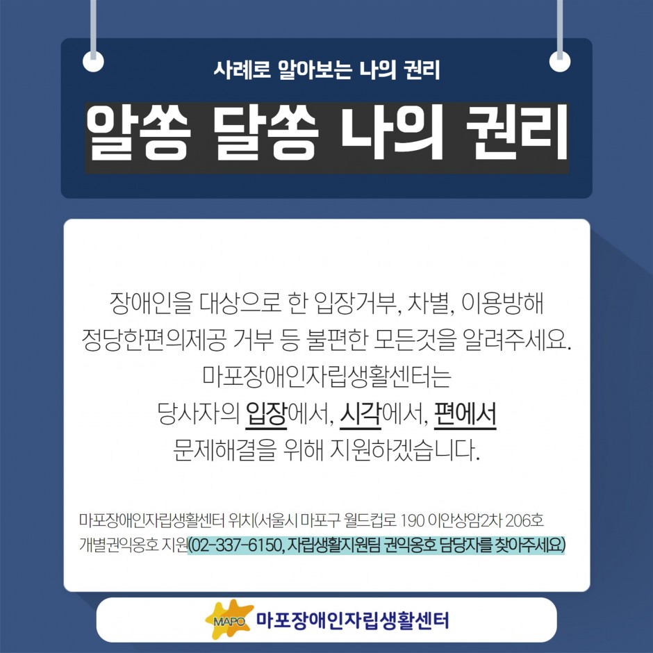 개별권익옹호 2월 카드뉴스 배포 페이지 정보 조회 804회 작성일 22-02-25 11:36 본문 개별권익옹호 2월 카드뉴스 주제는 '알쏭 달쏭한 나의 권리' 입니다.이런것도 침해일까? 궁금하신 부분 언제든지 센터로 연락주시면 해당 주제를 통해 재밌는 카드뉴스를 배포하겠습니다 감사합니다 ? 목록