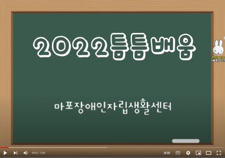 2022년 집단 ILP틈틈배움 페이지 정보 조회 611회 작성일 22-04-25 14:26 본문 마포장애인자립생활센터에서는 집단 ILP의 일환으로재미있는 자립생활기술과 문해 학습을 병행하는 틈틈배움 활동이 진행되고 있습니다.많은 참여자들이 만족해 하시고 있는데요~!틈틈배움 활동이 궁금하시다면 아래 링크를 눌러주세요^^틈틈배움 유튜브 바로가기 목록