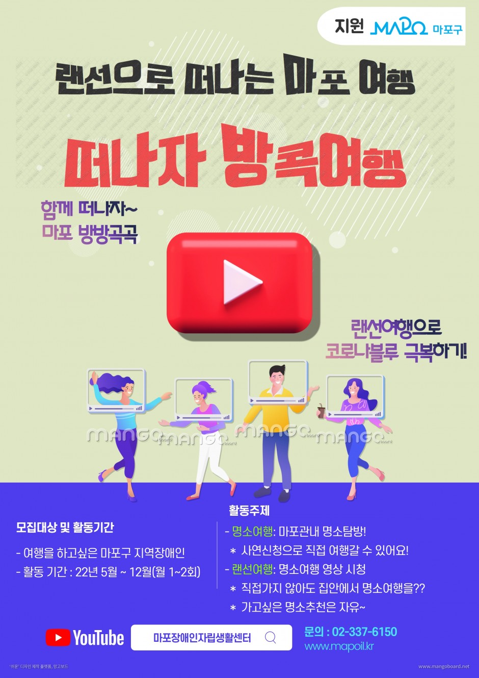 2022 마포구지원사업 페이지 정보 조회 1,653회 작성일 22-05-18 18:46 본문 2022 마포구지원사업 참여자 모집합니다.모집대상 : 마포구 지역장애인활동기간 : 2022년 5월 ~ 12월 목록