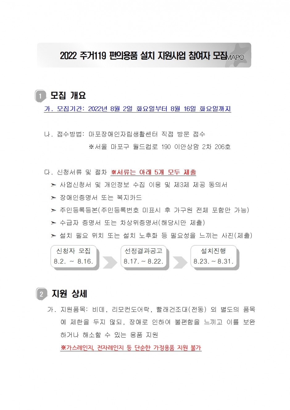 나. 접수방법: 마포장애인자립생활센터 직접 방문 접수※서울 마포구 월드컵로 190 이안상암 2차 206호